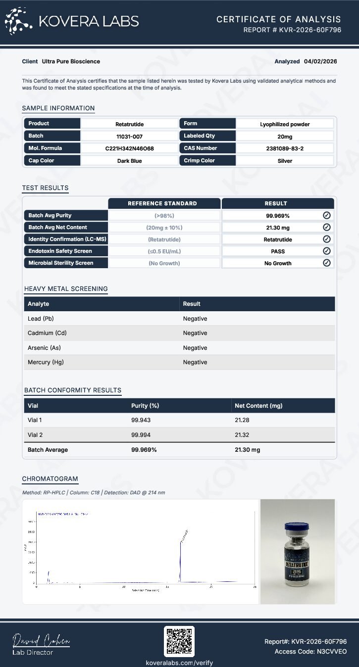 Retatrutide is a synthetic peptide analog frequently referenced in multi receptor and metabolic pathway research. Production utilizes controlled manufacturing workflows, and internal quality systems support lot level verification of identity and purity.